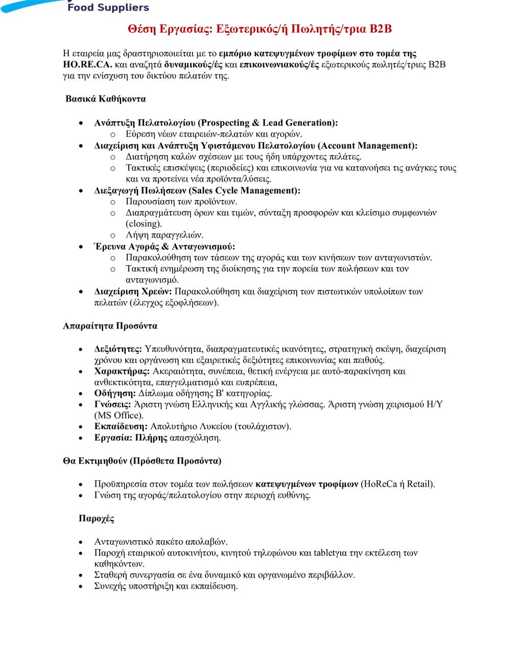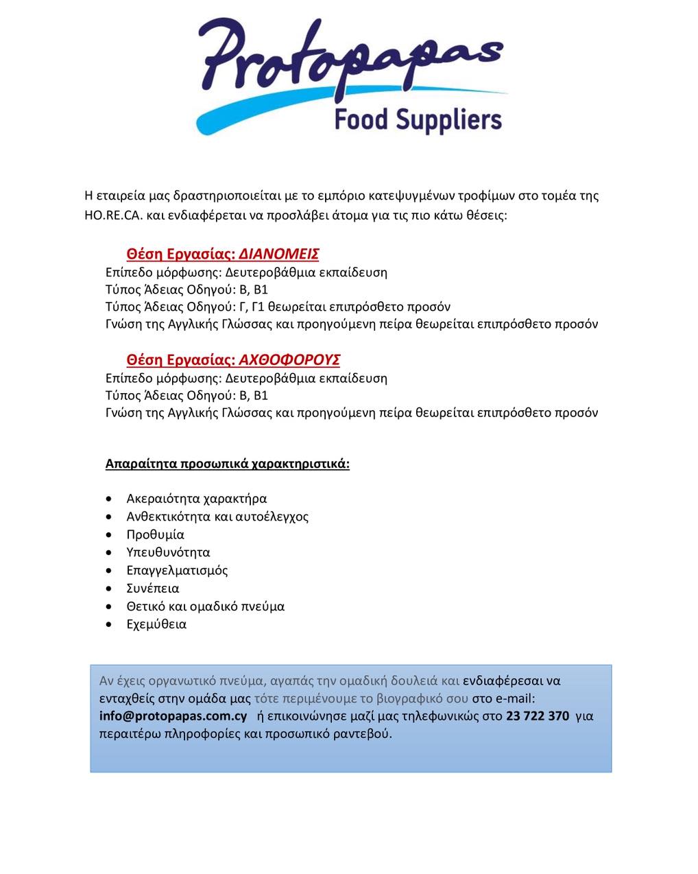 Η Protopapas Food Suppliers ενδιαφέρεται να εργοδοτήσει άτομα για τις πιο κάτω θέσεις εργασίας: