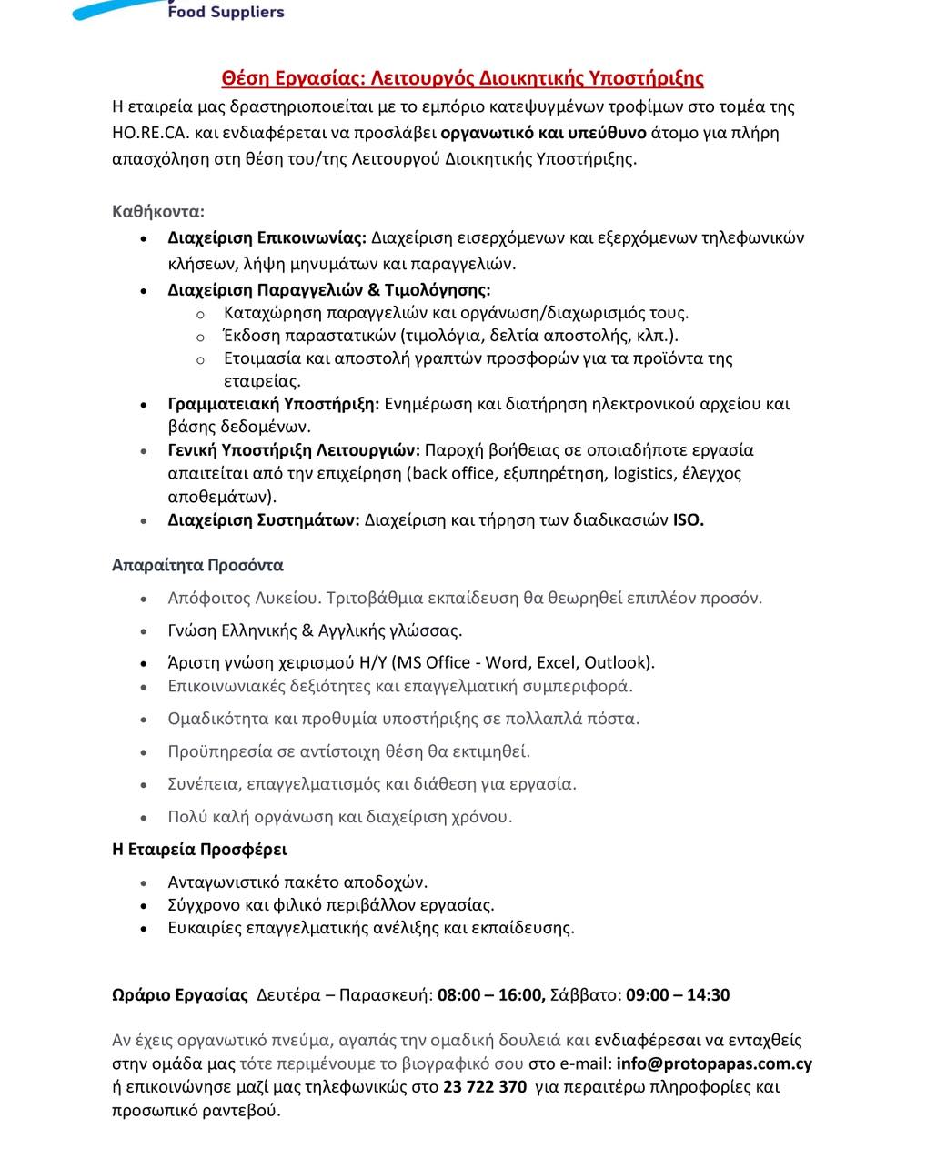 Γίνε μέλος της ομάδας μας στο Viber για συνεχή ενημέρωση!Protopapas Food Suppliers: 4 Θέσεις εργασίας – Αμμόχωστος