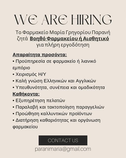 Pharmacy Maria Gregoriou Parani: Ζητείται Βοηθός Φαρμακείου ή Αισθητικός – Λευκωσία