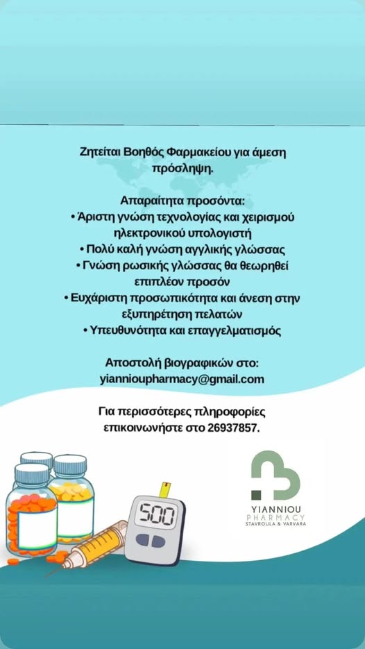 Yianniou Pharmacy: Ζητείται Βοηθός Φαρμακείου – Πάφος