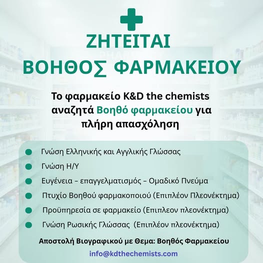 Email: info@kdthechemists.com με τίτλο: “anergosjobs.com”